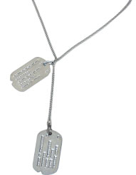 第二次世界大戦時のドッグ・タグ(陸軍)には"ノッチ"と呼ばれる切込みがあります※1。これには「死亡時に前歯の間に挟むため」という俗説がありますが、本来、刻印機にセット(位置決め)するためのものです。刻印される内容は、1.氏名、2.(陸軍)認識番号・破傷風予防注射摂取年(1941.11~※2)・血液型、3.~5.近親者の名前および住所(1940.12~1943.7)、5.宗派です