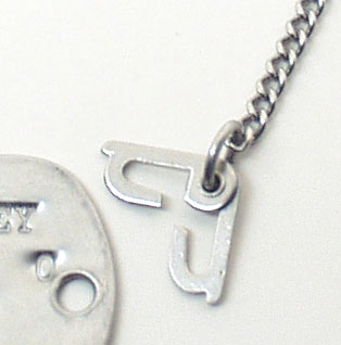 1940年~1945年までは主としてボール・チェーンではなく、特殊なフック(右上写真)がついた喜平チェーンが使用されていました※3。当店では第二次大戦タイプのタグと併せて、第二次大戦タイプのチェーン(復刻版)をオプション(+¥1,000)で販売