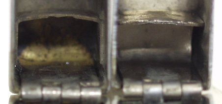 1938年、角のとれた「ラウンド・コーナー」と呼ばれるモデルが導入されます(右は1938年の広告)。新しいプレス機による一体成型のケースは革新的で、65年以上もの年月を感じさせない完成度を誇ります。ヒンジ(蝶番)は4バレル(4つで構成)のままで、インサートの型も1936-37年モデルがほぼ継承されますが、カム(インサート左上のパーツ)を機能させるスプリング(バネ)はピストンからリーフ・スプリング(板バネ)に変更されます。